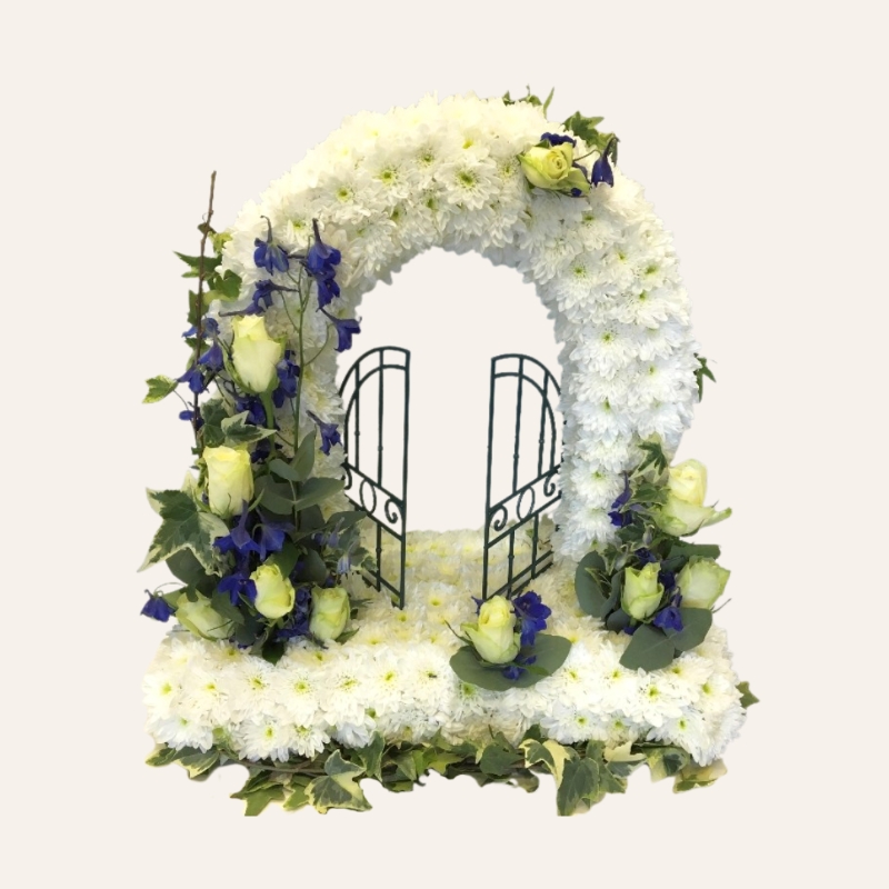This Gates of Heaven tribute is carefully designed with a white chrysanthemum base, enriched with a striking deep blue focal and finished with a natural ivy edging. A meaningful design that conveys peace, faith and everlasting love.