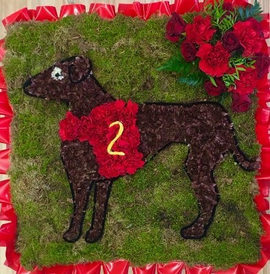 Our Racing Dog Funeral Tribute is a heartfelt design, handcrafted with love and care by our in-house florists. The piece is created on a moss background, with the dog formed from sprayed chrysanthemum and finished with red carnation accents and detailed pipe cleaner work to define the shape. A coordinating ribbon edge completes the design, bringing the tribute together beautifully.