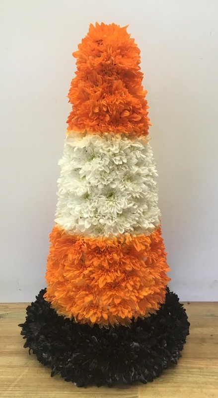 This 3D Traffic Cone Funeral Tribute is a distinctive design, created with sprayed chrysanthemums in vivid neon orange and white, finished with a black base for contrast. A traffic cone isn’t something you’d usually expect to see in florals — but that’s what makes this tribute so personal and meaningful.