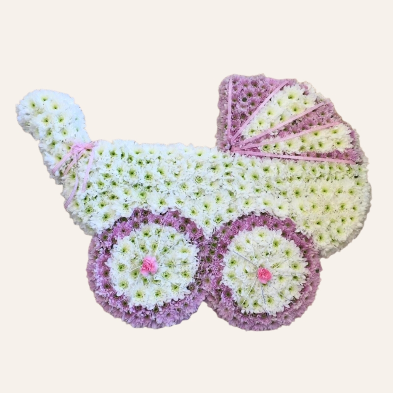 • Pink pram-shaped funeral tribute made with white and pink sprayed chrysanthemum, finished with pipe cleaner and spray-painted detailing, measuring approximately 80cm x 60cm.