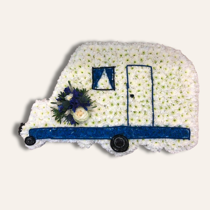 Our Caravan Funeral Tribute is a thoughtful and personal design, created using a massed base of white chrysanthemum with carefully sprayed detailing. The design is enhanced with pipe cleaner and laminated accents to add definition and structure. A focal of mixed seasonal flowers can be added in a colour of your choice, making this tribute truly individual and meaningful.