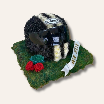Our Motorbike Helmet Funeral Tribute is a detailed 3D floral design, created with love and care to reflect your loved one’s personality and passion for motorbikes. Each tribute is handcrafted to your specific requirements, with the option to customise colours, stickers and overall style to match their favourite bike or gear.