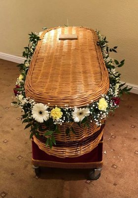 A beautifully crafted garland of delicate foliage and seasonal florals, arranged in a colour scheme of your choice to perfectly complement the wicker casket.