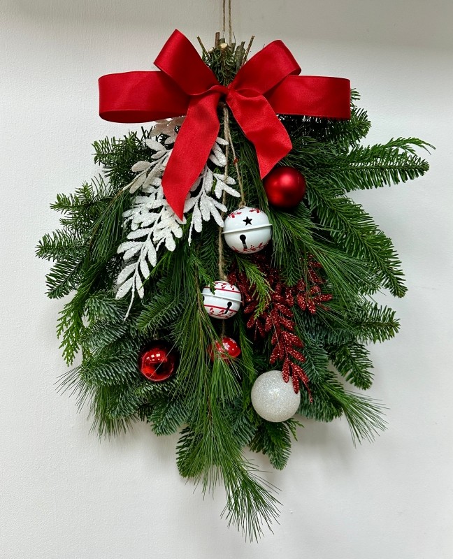 Looking for something a little different for your door decor this festive season? Our sleigh bell's swag is the perfect option, a bursting bundle of winter foliage finished with glitter decor, baubles, trio of bells and a big red bow.