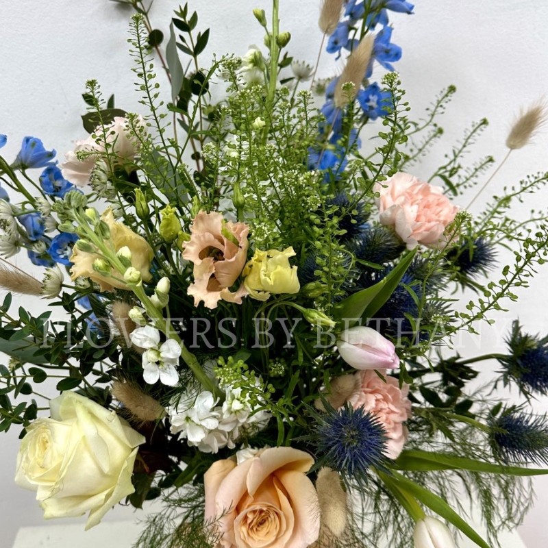 A beautiful mix of peach, pink and blue toned florals. Perfect created with seasonal varieties such as roses, stocks, delphinium, lisianthus, thistle and so many more.