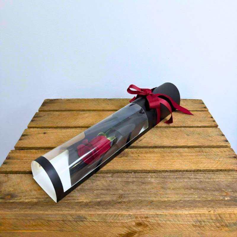 • Luxury single red rose displayed in a black presentation tube with a clear window, red ribbon bow and diamante centre detail.