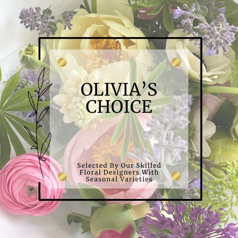 Olivia’s Choice is a beautifully curated bouquet featuring a selection of seasonal florals chosen in Olivia’s favourite style. Expect a soft, romantic blend of pinks, whites and pastel tones arranged in a loose, wild garden style for an effortless, elegant finish. Each bouquet is slightly different, making every design a one-of-a-kind floral moment filled with charm and gentle colour.