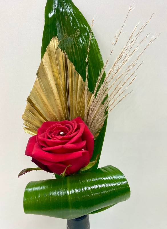 •  Single red rose displayed in a slim black ceramic vase, accented with gold spear, baby pampas grass, and folded aspidistra leaves.